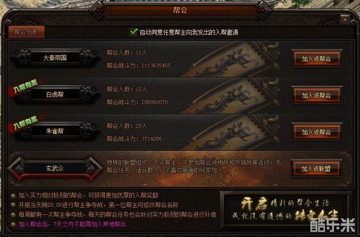 那么都有哪些帮会呢?一共有4个帮会可以加入:青龙,白虎,朱雀,玄武!剩下的就不废话多说了,除了玄武是中立的这一点大家要记住了。