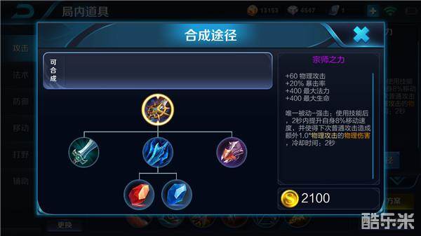 综合属性:攻击速度+26%、暴击率+5%、物理攻击+9、物理穿透+64、移速+10%