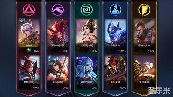 l 如图,百里守约和诸葛亮均为红色阵营,安其拉和艾琳则为黄色阵营,宫本武藏为紫色阵营