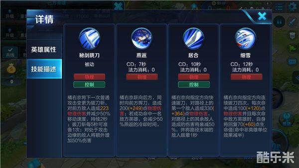 被动-秘剑胧刀:橘右京将强化下一次普攻变为拔刀斩,对前方的敌人造成物理伤害和减速效果,拔刀斩在一定时间内都可触发一次,对处于攻击边缘的敌人将造成额外的伤害。