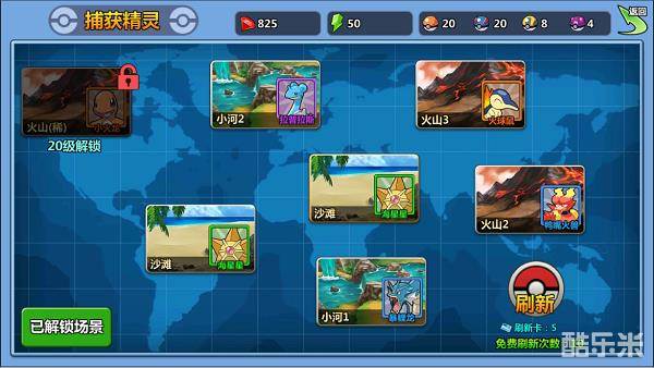 宠物场景分为白、绿、蓝、紫、橙5种,分别对应着可遇到的精灵品质。使用免费次数或刷新卡可以刷新场景,免费次数每6分钟恢复1点,刷新卡可以开宝箱和在商店获得