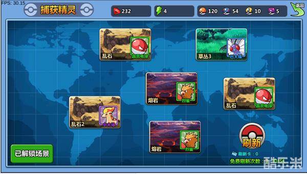 场景分为白、绿、蓝、紫、橙5种,每个场景对应着该品质的精灵,展示在场景面上。刷到自己想要的小精灵,不要犹豫带上精灵球进去捕捉吧