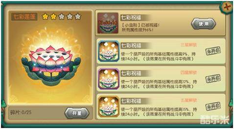 七彩莲蓬是十一章解锁,解锁后可以靠十连抽抽到。七彩莲蓬每次使用要二十个宝石(只有葫芦娃可以使用,1-7许愿一次二十个宝石,小金刚十个,山神鸟小蝴蝶不行)。