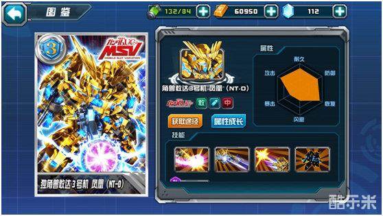 与均衡属性相匹配的,是独角兽3号机 凤凰(NT-D)灵活巧变的技能设定。《敢达决战》此前推出的机体,其每项技能都有固定效果。独角兽3号机 凤凰(NT-D)则会根据自身耐久值的即时情况,让同一技能发挥不同的效果:当机体耐久值高于50%时,“光速斩击”能够提升自身所有防御,“NT-D模式”能够提升我方全体的攻击频率并降低敌方全体的相同属性;当机体耐久值不高于50%时,两项技能则能起到大幅度恢复耐久值的作用。