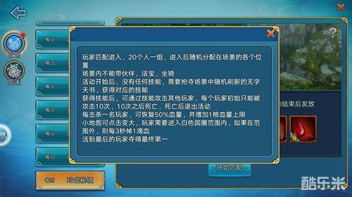 “玲珑秘境”活动于每晚19:00正式开启,玩家报名并匹配成功后即会被随机传送至逃杀地图的任意地点,与其他玩家展开生存竞争。进入活动后,玩家不能使用任何伙伴、法宝和坐骑,技能也将全部失去,要靠抢夺场景中随机刷新的“无字天书”来重新获得。因此,在活动初期巧妙利用地形躲避危机、积蓄实力就变得尤为重要,冲动应战往往会得不偿失。
