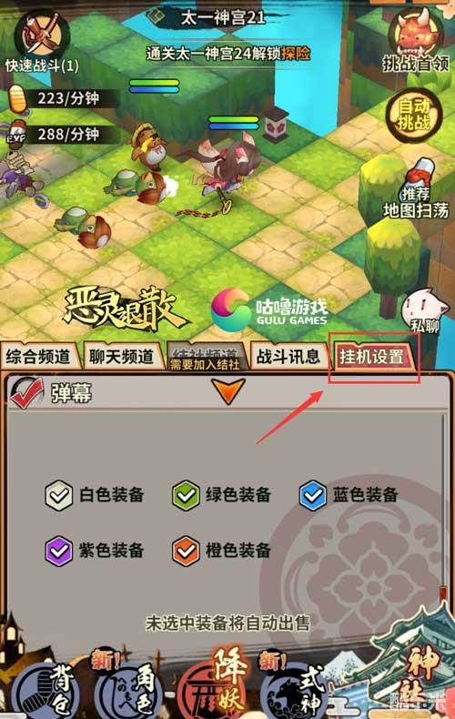 A:在降妖界面点击左下角“聊天”后,选择“挂机设置”分页,可自由选择挂机获取的装备的处理方式,勾选装备=保留入背包,不勾选装备=自动出售换成金币。
