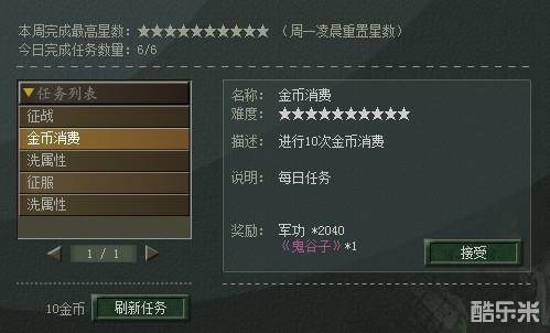 还有种情况就是大家有时候怎么刷都刷不出来,若是rmb大神继续刷我不说什么。要是和我一样都是小户人家,那就不妨试试接攻击和金币消费任务完成它在去刷任务(金币消费的任务次数尽量让他多,别立即完成。比如6星让你完成6次金币消费,你完成10次再领取奖励)。这样做很容易会有下一个星的任务出现,一次不行完成两次,小户人家别死钻牛角尖,