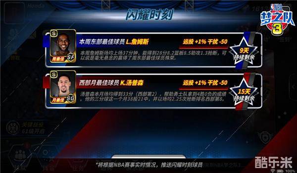 巅峰等级的出现,使得在核心球员培养上有了进一步的突破;闪耀时刻使得游戏中的球员与现实联系更加紧密;东西部争霸赛上出阵的球员需按照球员的地域归属进行,将更深层次地优化球队阵容,打造自己心目当中的梦之队;今日NBA系统则是让玩家们不错过NBA任何一个精彩的镜头,将焦点之战一网打尽!