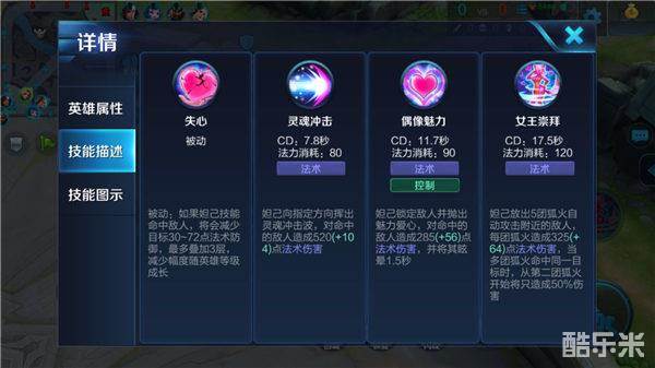 被动技能——失心:被动技能时妲己伤害爆表的主要来源,利用技能伤害降低敌方的法术抗性,并且自身等级越高,减少抗性的数字越大,因此等级对妲己非常重要。