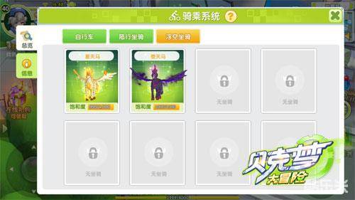 在《贝克梦大冒险》骑乘系统里,可以看到骑乘工具分为自行车和精灵坐骑,而精灵坐骑分为陆行坐骑和浮空坐骑这两种。