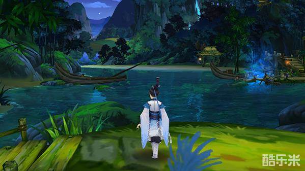 举个例子,穿越山涧时的视角转换却让我感到震撼。由远景,到中景,最后对纯阳弟子背影的特写,直接用镜头语言将我们带入了这个水墨世界。3D全景视角的自由切换,营造了画面上的纵深感。你会感到游戏画面中的山水,花草,太阳都是有生命力的。