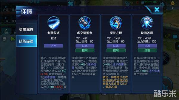 被动-制裁仪式:但钟馗受到较高单次伤害时会引发爆炸(有CD),对范围内敌人造成法术伤害。在钟馗死亡后,短暂时间内会引爆自身所处区域,对范围内敌人造成法术伤害。
