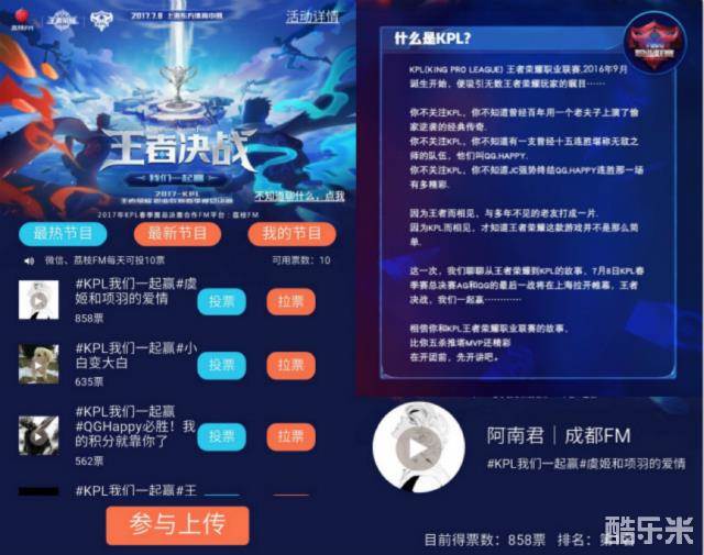 有些故事虽然很囧但很热血,你想不想也来跟大家分享一下你的故事呢?7月4日开始, “荔枝FM”情感频道中说出你与KPL的故事正在火热进行中!有多热爱KPL王者荣耀职业联赛,就会有多少说不清道不明的情绪,相信也会有说不完的故事。