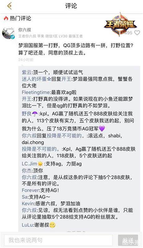 可见这位“你六叔”誓死追随AG超玩会,并对同样是AG超玩会粉丝的小伙伴毫不吝啬,这样一条评论,一大批AG超玩会粉丝浮出水面,大家纷纷表示对梦泪打野霸主地位的认同,希望AG超玩会能够夺冠!