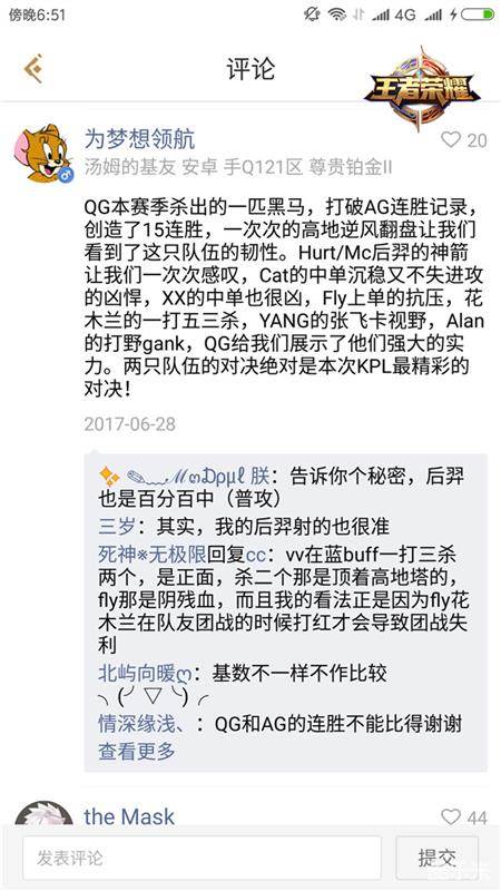 这位名为“为梦想领航”的网友评论表示QGhappy是本赛季杀出的一匹黑马,两支队伍的对决绝对是本次KPL最精彩对决!