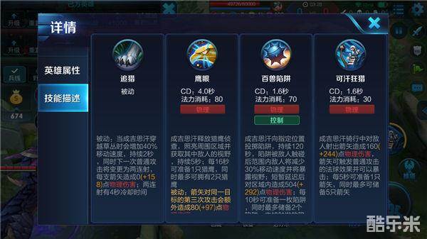 被动-追猎:成吉思汗经过草丛时会增加自身移动速度,下一次普通攻击射出两箭,两连射有所冷却。