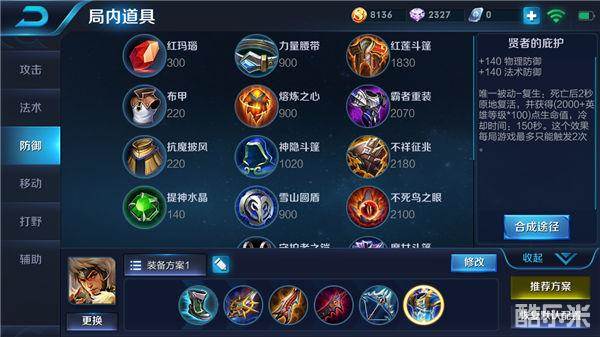随着游戏接近尾声,敌方的肉盾可能会堆叠护甲或是技能自带的护甲,而此时就很需要有护甲穿透类型的道具,而一件防御装保证自身的生存能力也就尤为重要,但是这个版本贤者的庇护有着一局只能使用两次的限制,所以在选择上就需要稍加斟酌了,也可以用不祥征兆或是魔女斗篷代替。