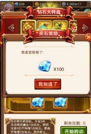 转大转盘前的准备工作除了上好洗面奶之外,还得准备启动资金88钻石。我相信通过各种活动这么点小启动资金还是小case的。钻石大转盘赠送1次机会,每充值5元即可获得额外1次机会。所以想要大收获必须还是得小付出的。