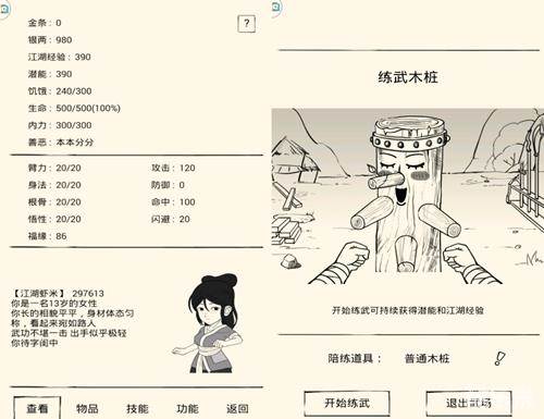 另外,武功会对人物基础属性有所加成。这一点在游戏中后期效果较为明显,因为部分门派对入派弟子部分属性有要求。1臂力增加10生命、5攻击、10饥饿值;1身法增加1命中、1闪避(身法数值决定战斗出手先后,身法高的先出手);1根骨增加10内力、10生命、增加0.2左右修炼速度,10根骨每秒12左右修炼速度;1悟性减少0.1%左右潜能消耗,每10悟性提高1修炼上限。