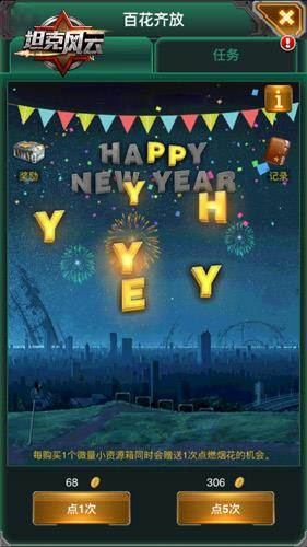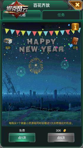 点燃烟花,在战争的世界中增添喜庆的气息,《坦克风云》将变得焕然一新。指挥官在活动开启后,点燃烟花,收集新年快乐的英文字母,完成任务,即可获得对应的奖励。同时,每次点燃烟花,都可以获得一份奖励。
