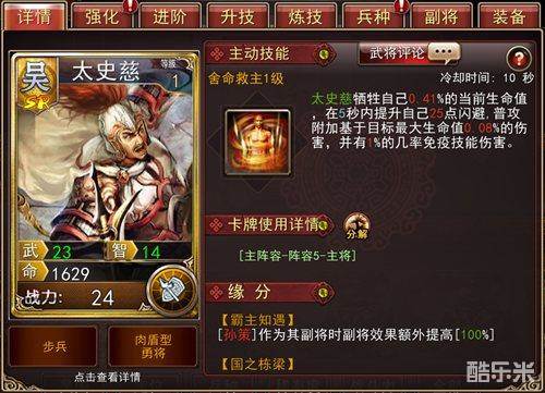 游戏中的太史慈作为一员步兵,虽然只是SR的品质,但是出色的武力成长和生命成长深受各位主公喜爱。更是拥有超强技能“舍命救主”可以牺牲自身少量生命值,在5秒内提升自身闪避,并且使普攻附加基于目标最大生命值系数的伤害,可以说一旦技能释放,太史慈瞬间变成猛虎,无情的撕咬他的对手。