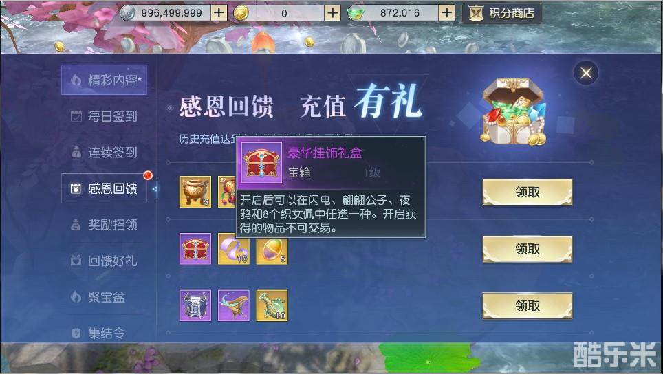 在这份感恩大礼中,开花组准备了高级挂饰、魂钉龙晶、璀钻紫玛瑙等各类珍稀道具回报天命者们。没有门槛、不需要做什么任务,《镇魔曲》将根据过往这一年里天命者们的所有充值记录送上感恩回馈大礼,天命者们只需要把它们领回家就好!