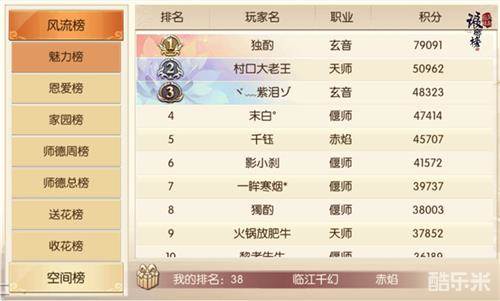 风流榜之上记录的均是江湖上的神仙眷侣、才子佳人和良师益友,此排行的评定标准不再是各位玩家的硬实力,而是从各个分支排行呈现的个人魅力或是夫妻间的感情等等。如果想近距离接触高颜值的小哥哥和小姐姐,或者想找个暖心的小伙伴做朋友的话,就时常关注琅琊风流榜吧!