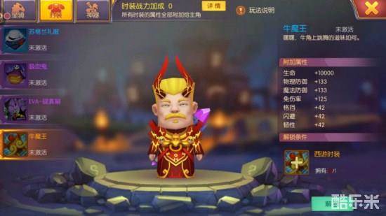 看完美女的时装秀,下面你让我们来看看的威武帅的男装。方砖牛魔王的形象,你有没有被雷到呢?该时装出自西游记时装系列。整体时装以红色为主,并在胸前配有散发着金属光泽的头牛配置,更显该时装蕴含着十足的王霸之气。头饰1组竖起冲天的犄角,成为整套时装的点睛之笔,同时也装扮出牛魔王的形象。