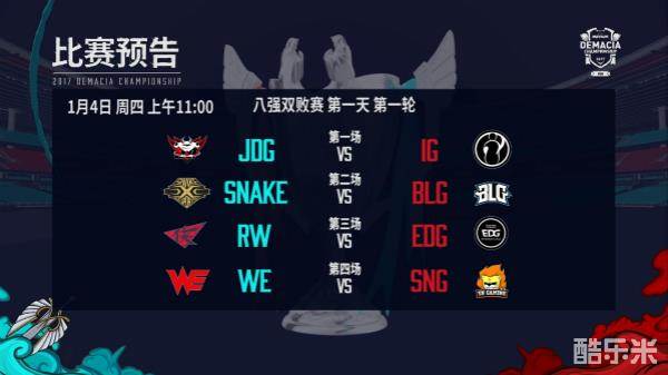 本届德玛西亚杯八强首轮比赛:JDG vs iG,Snake vs BLG,RW vs EDG,WE vs SNG。