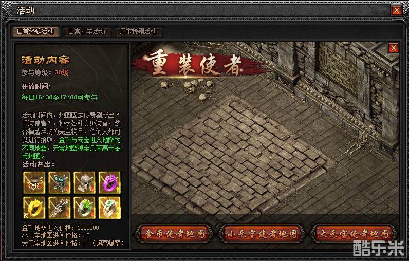 众所周知,每天的重装使者是一定要去打的,因为总是能爆出好装备和武器,例如轮灭、玲珑扇45级的武器等,这个平时打野地BOSS掉落的几率都没重装使者的高,而且还听说大元宝使者地图曾经爆出倚天的惊天奇迹,更惹得我们这些屌丝玩家更是拼命打重装,等待着有一天打出屠龙倚天,来个屌丝逆袭,寻找到传说中油腻的师姐。