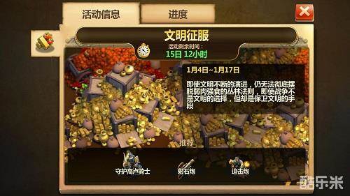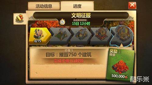 在文明征服活动期间,累计摧毁敌方建筑可以获得额外的奖励,不同时代拥有独立的达成条件和奖励内容。想要获得更多的资源,那便带领文明进化到更高级的时代吧,为文明进化而努力吧。