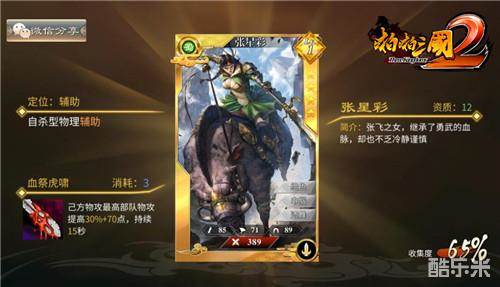 张星彩,张飞之女,继承了勇武的血脉,却也不乏冷静谨慎。在《啪啪三国2》中,张星彩的定位是自杀型物理辅助,大招“血祭虎啸”可提高己方物攻最高部队的物理攻击,随着自身生命值的减少可提升小幅物攻。