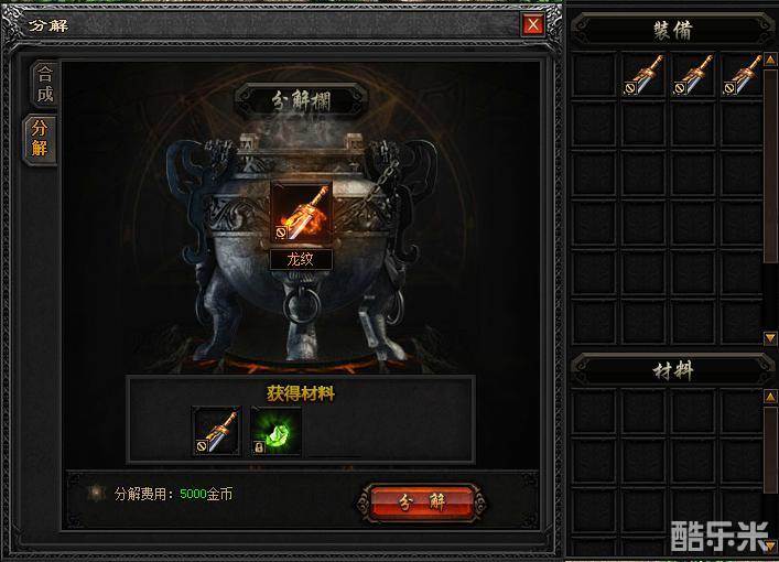 使用3件同样品质的装备,成功合成后,将提升主装备品质!主装备的所有特殊属性及强化等级将完全保留!若失败,副装备及材料将被消耗!