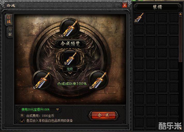 顶级的橙色装备将不可进行合成。使用少量元宝加持还可提升合成几率,避免副装备及合成材料的损失!