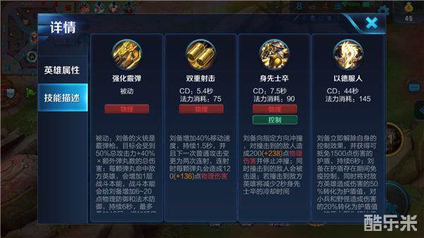 一技能——双重射击:一技能可以提升刘备的机动性,进可攻退可守,并且施放后能加强下一次普攻变为两次射击,增强其战场输出。