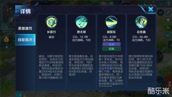 胡茄乐:蔡文姬向指定方向弹奏一束音波,命中目标后会在敌人之间弹射,每次弹射造成法术伤害并造成眩晕,对同一目标造成多次弹射时伤害减半。蔡文姬的唯一一个控制技能,在敌人聚集在一起时释放,效果更佳。