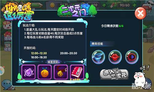二次元之门是逗比大乱斗的玩法,每天分三个时间段开启,而且只开启半小时,错过就要等下一次啦。每场乱斗凑够6位玩家即可开始,每位玩家初始拥有40血量,大家在游戏中相互整蛊攻击,每次被攻击就耗费2点血量,血量耗尽就意味着本场失败。每局游戏结束后都会有排名奖励,依照战斗中的表现给予不同的道具!