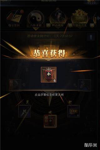 游戏中,八卦求福正是各位主公积攒运气到了爆发的时刻。八卦求福的八卦阵中,八个方位分别为乾、坤、震、巽、坎、离、艮、兑,对应不同奖励。其中有基础资源,6万的银两、粮草、铁矿各占一档,升级校场必须的战鼓共6个占一档,升级外交必备的令旗,数量也为6个占一档,还有三种宝物,分别是宝马绝影、紫色宝剑干将剑,橙装青龙护天铠。