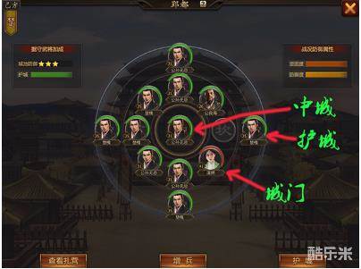 城池是有进攻和防御加成的,越靠近己防的城池获得的进攻防御加成越高,城池的中门是没用这些加成,另外占领城池中门和四个护城位也能为城门提供大量防御加成,但是中门位不享受任何加成。所以在进攻城池时首要目标就要打掉对手的中门。