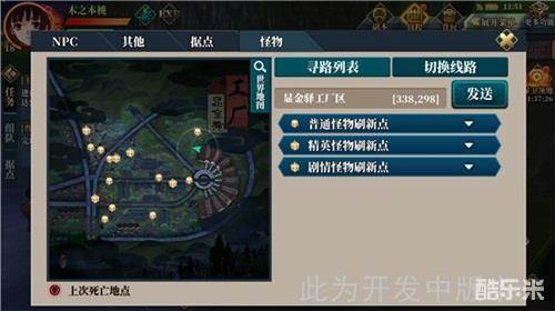 而怪物选项的页面中,不仅显示了当前地图的所有怪物的位置,还可以通过点击怪物图标自动寻路到怪物所在地点。