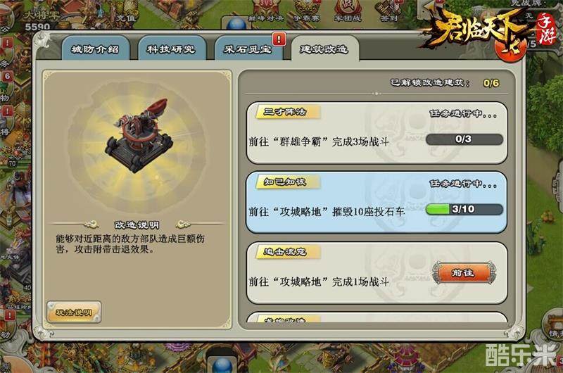 在升级至13级中军大营之后,各位主公将会结识一位全新的NPC角色,他将带领大家了解建筑改造系统。建筑改造顾名思义就是将特定建筑进行改造,被改造的建筑将拥有新的形态,在功能上也会与之前有所不同。比如改造后的流星弩,其射程和攻击速度所降低,但是却能够对目标瞬间倾泻大量伤害。主公们可以利用这些不同的效果特性,随意切换建筑的形态,用来适配不同的阵型和部队,打造百变战术!