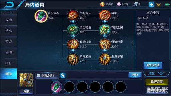 解析:鬼谷子在游戏开局时个人作用极大,因此需要频繁的游走在各个路线和野区中,以将个人作用发挥到最大,但这会导致鬼谷子经济增长缓慢,装备不易成型,但若出门选择装备学识宝石,则能根本上的加快鬼谷子的经济增长速度,为其中后期个人作用得以正常发挥提供了条件,且学识宝石还加强了鬼谷子的移速,进而加快了鬼谷子游走的速度,极大的简化了鬼谷子配合友军建立优势的难度。