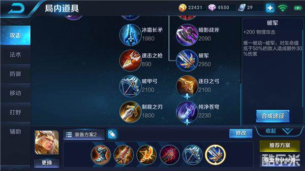 破军可以让后羿的伤害输出能力提高一个层次,后期的后羿可以轻松将脆皮英雄打成残血,此时利用破军的被动效果可以让自己攻击血量低于一定百分比的敌人时,附加一定百分比的伤害,从而能够让后羿对敌人造成爆炸伤害。