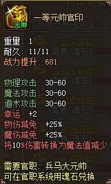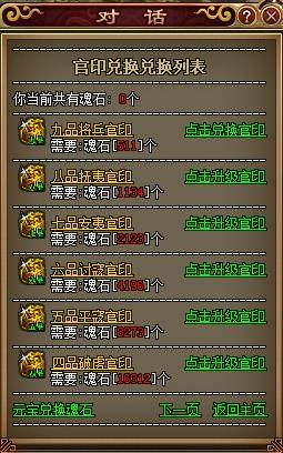每个级别的官印属性也是非常好的,.能让你战斗力飙升的哦。九品和一品的属性也是相差非常大的.这个法师的官印.魂石的话可以用元宝直接兑换,也可以在熔炉里边装备回收获得!!!