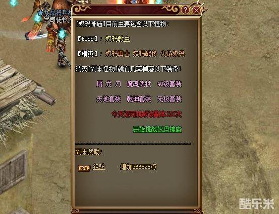 奴玛神庙是《武尊》沙漠土城第一个单人副本,主要包含的怪物包括:精英级奴玛勇士、奴玛战将和火焰奴玛,以及BOSS级奴玛教主。在打败这些怪物后,除了获得366525点经验之外,还会有一定几率赢得屠龙刀、魔魂法杖、天地套装、乾坤套装和无极套装等,每天都有3次的挑战机会等着玩家去战斗。