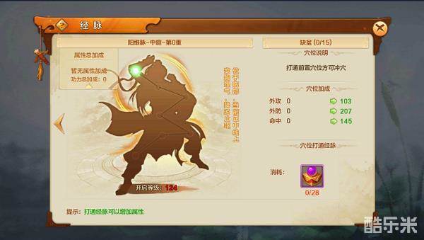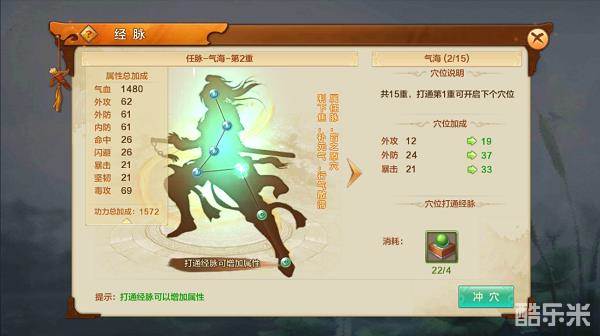 每一套经脉都有15重,需要打通第一重才能开启下个穴位。也正因为如此,在提升的时候就需要一定的计算了。