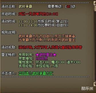 事实上,如果今天你和你的行会失败了,那么不用气馁,武林盟主的头衔只能携带24小时,也就是说次日的武林争霸即可在次争夺,而你只需要改善上次失败的因素,与你的兄弟们在次并肩作战,我相信肯定有一天这个光荣的头衔就将在你的头上。