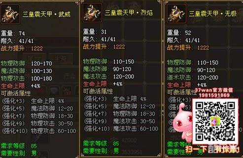 上图是武尊三皇套装中的战甲的属性,分别对应着战士、法师和道士三大职业,不同职业的属性稍有不同。相对而言,战士获得的防御高一点,但攻击比道士和法师稍低,不过相差不大。对于强化后的属性加成,三大职业则是一样的。也就是说起跑线虽然轻微不同,但步伐是一致的。