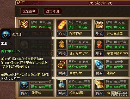聚灵珠有两种,一种是每杀3只怪物,就能获得大量的经验,杀满600只怪物之后效果就会消散;另一种同样是每杀3个怪,就可以获得大量经验,不过是杀满300只怪物之后效果就会消散,可看出,两种聚灵珠的差别只是在杀怪数量上。