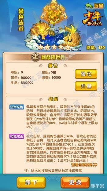 作为金色法术书,“麒麟降世舞”拥有特色法术充能玩法。它可使佩戴者在回合开始前吸取敌方所有神将一定百分比(特性情况下翻倍)的防御。该技能可在降低敌方整体防御的同时,增强佩戴者的抗击打能力。